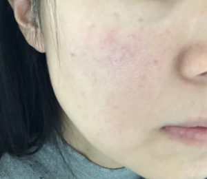 目の下あたりのシミ、頬に赤い帯状の荒れ、吹き出物。